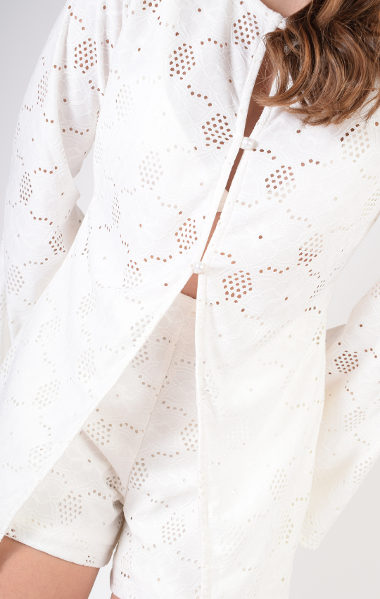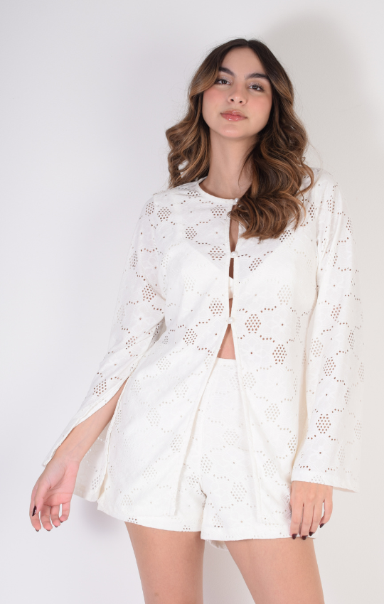 Set Encaje Flores Blusa Manga Larga + Short Blanco