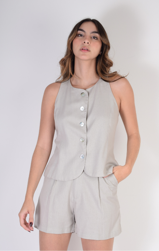 Set Chaleco Cuello Alto + Short Con Pliegues