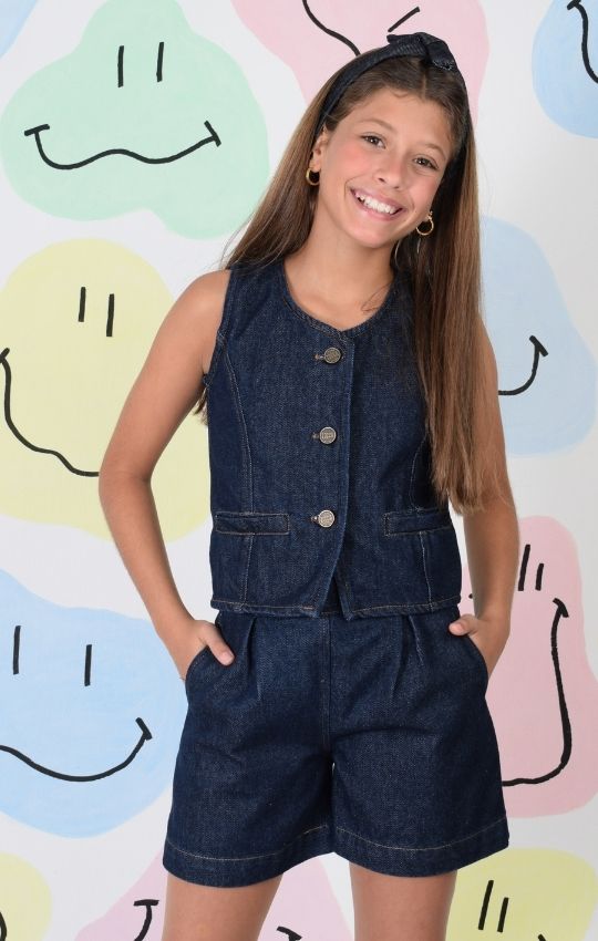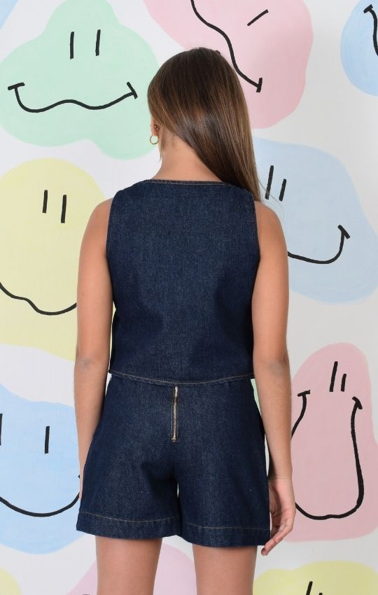 Set Denim Chaleco + Short Con Pliegues