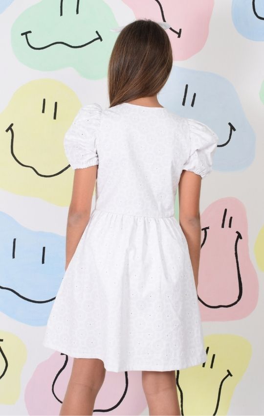 Vestido Blanco Manga Globo Y Falda Fruncida